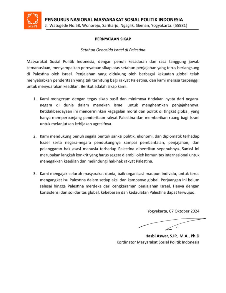 PENGURUS NASIONAL MASYARAKAT SOSIAL POLITIK INDONESIA Jl. Watugede No.58, Wonorejo, Sariharjo, Ngaglik, Sleman, Yogyakarta. (55581) PERNYATAAN SIKAP Setahun Genosida Israel