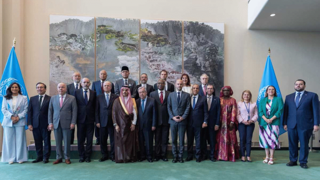 Konferensi Tingkat Tinggi di Markas PBB, New York, pada 28–30 Juli 2025, diketuai bersama oleh Prancis dan Arab Saudi untuk mempercepat implementasi solusi dua-negara. Dokumen hasilnya, New York Declaration, menegaskan langkah “tangible, time-bound, and irreversible” guna mengakhiri perang di Gaza dan menata jalur menuju Palestina berdaulat berdampingan dengan Israel. Rumusannya lahir dari delapan working groups lintas isu yang diketuai 19 negara/organisasi dengan mandat menyusun rekomendasi operasional (French Republic & Kingdom of Saudi Arabia, 2025). Arsitektur kebijakan ini memadukan perangkat politik, keamanan, kemanusiaan, ekonomi, hukum, dan narasi strategis secara berlapis. Desain waktu yang tegas dimaksudkan agar proses tidak kembali pada kebuntuan siklus kekerasan. Penyiapan tindak lanjut menuju Sidang Majelis Umum PBB berikutnya menjadi jangkar legitimasi politik. Keterkaitan erat antara capaian jangka pendek dan horizon konsolidasi jangka menengah menjadi prinsip pengarah keseluruhan paket.
